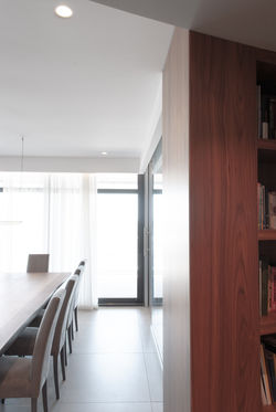 A continuous ribbon of full-height, aluminium-glazed sliding doors blurs the threshold between inside and out, inviting light, air, and panorama into every moment of daily life. These openings lead to a deep, sheltered terrace — an outdoor room hovering above the urban fabric.